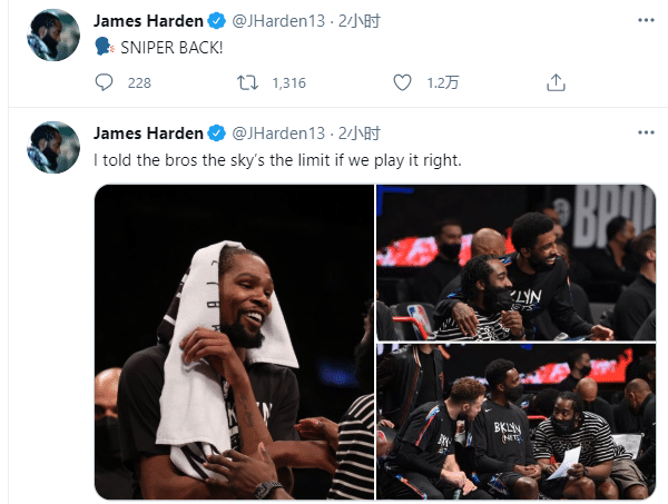 360直播吧4月9日讯 篮网巨星詹姆斯-哈登更新动态,晒出三张合影并且发推写道:我告诉兄弟们,如果我们打得好的话,天空才是我们的极限;哈登还专门发推写道:高呼杜兰特回来了!(SNIPER狙击手是杜兰特的绰号);篮网官方转发哈登的动态。