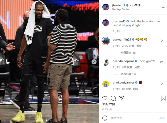 哈登因腿筋拉伤而休战,但养伤期间也不闲着,哈工头变身登指导;哈登还在Ins上更新同样的动态,格里芬在评论区留言,回应三个表情包。