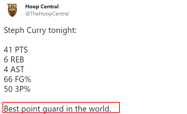美媒Hoop Central则重点列出库里这场比赛的数据,除了41分6板4助,库里的投篮命中率达到66%,三分命中率50%。“世界上最好的控卫,”Hoop Central称赞道。