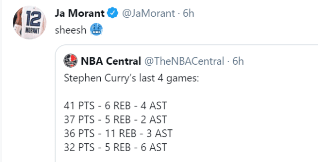 美媒NBA Central列出了库里过去4场比赛的数据:41分6板4助、37分5板2助,36分11板3助,32分5板6助,状态相当出色。灰熊球星莫兰特秒变小迷弟,他转发了这一动态感慨道:“天啦!”
