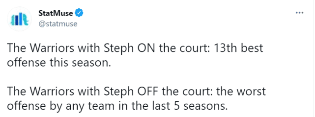 数据网站Stat Muse从另一个角度体现库里的重要性。他们写道:本赛季库里在场时,勇士的进攻效率排在联盟第13位,而本赛季库里不在场时,勇士的进攻效率只有99.8,比过去5年任何一支NBA球队都要差。勇士对库里的依赖性,由此可见一斑。