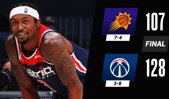 360直播吧1月12日讯 NBA常规赛,东部垫底的奇才主场爆冷21分大胜西部第二太阳。而且在这场比赛中,奇才在第二节一度领先32分,虽然太阳不愿过早认输,但比赛事实上还是早早进入垃圾时间。而在威少缺阵的情况下,比尔再度挺身而出,轰下34分9助8板的数据。此役之后,比尔也创下纪录