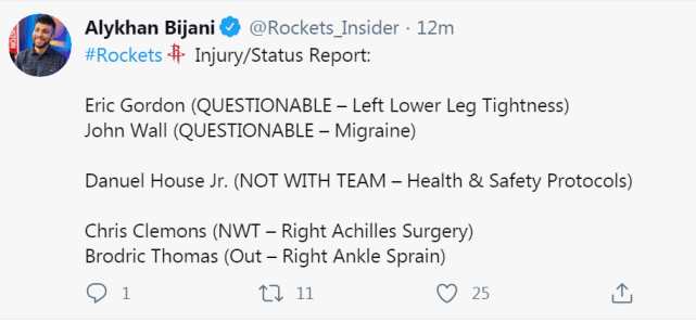 360直播吧讯 北京时间1月12日,火箭队进行训练,备战和湖人的第二场比赛。对于火箭来说,他们的首发可能会有所变化。据主帅赛拉斯在采访中透露,沃尔由于偏头痛缺席了今天的训练,明天的比赛是出战成疑(questionable,50%上场概率)的状态,而此前由于背部痉挛连续缺席4场比赛的豪斯,出现了新状况,他将因健康安全协议接受隔离,预计缺席更多的比赛。