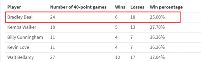 360直播吧1月11日讯 轰下40+的分数,球队却赢不了球,这显然是一件令人扎心的事。本赛季至今,奇才球星比尔两次得分突破40分,球队却都输了比赛,把上赛季也算上的话,近两年,比尔有12场比赛得分40+,奇才竟然输了其中11场。近日,美媒HoopsHype公布了一份历史球星40+得分的胜率排行榜,比尔排名倒数第一。