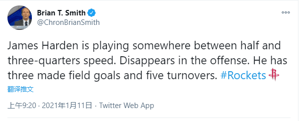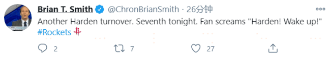 值得一提的是,本场比赛的14次出手,是他连续三场比赛的15次以下的出手、4场比赛的20次以下的出手。如此表现也是引起了不少质疑声,名记Brian T.Smith在半场的时候就批评哈登消失了,他还披露现场有球迷高喊:“哈登醒醒吧!”