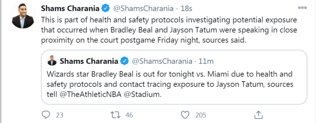 塔图姆确诊新冠,为什么比尔要被隔离?查拉尼亚随后给出解释。“联盟的健康和安全协议会调查潜在的接触,而比尔和塔图姆在当地时间周五晚上的比赛之后,有过一次非常近距离的交谈。”换言之,比尔很有可能因此感染,他需要先隔离接受更多的检查。
