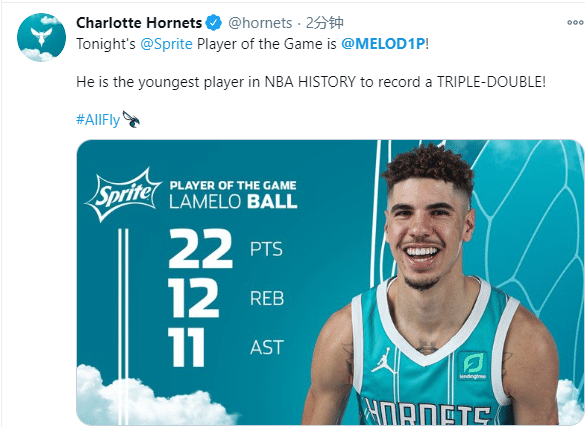 年仅19岁140天,19岁三球超越17年状元富尔茨(19岁317天)成为史上最年轻三双先生,第三年轻的是东契奇19岁327天时轰下三双;赛季至今,三球为黄蜂替补出战十场比赛,上一场和哥哥郎佐-鲍尔同场竞技,他只差一次助攻就拿到三双,如今三球终于创造历史。