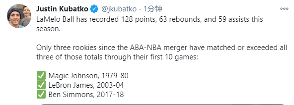 三球生涯至今总共拿到128分63个篮板59次助攻,自从ABA-NBA合并以来,NBA历史仅有三名新秀在前十场拿到或超过这样的数据——79-80赛季的魔术师、03-04赛季的詹姆斯和17-18赛季的西蒙斯,三球成此项纪录历史第四人。