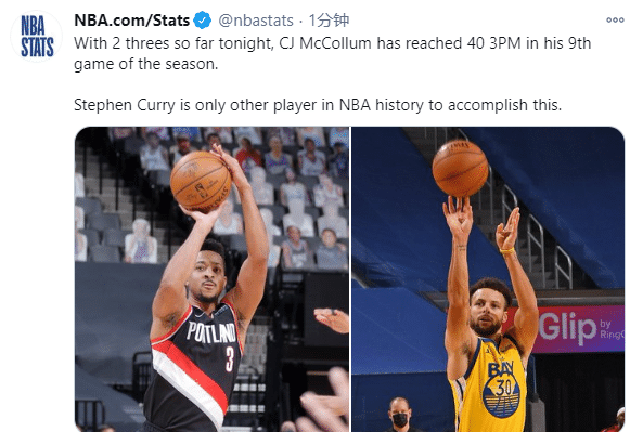算上本场6记三分,麦科勒姆前9场比赛投进44记三分球,比肩库里成为NBA历史上第二位做到这一点的球员;麦科勒姆生涯总得分达到9135分,正式超越拉希德-华莱士(在开拓者拿到9119分)升到开拓者队史总得分第十位,下一个要超越的便是汤爹迈克尔-汤普森(9215分)。