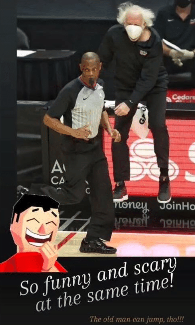360直播吧1月10日讯 近日波波维奇吸引了不少人的关注,这位72岁的老帅已经达成了执教NBA场次1900场里程碑时刻,位居历史第9,虽然已经72岁高龄了,但波波维奇在场边依旧激情四射,本赛季还有因为质疑判罚被驱逐出场的时候。波波维奇在场边激动的画面也在网络上走红,主要是白发的波波维奇跳起来朝着裁判抱怨,甚至被自己的弟子吉诺比利恶搞调侃。