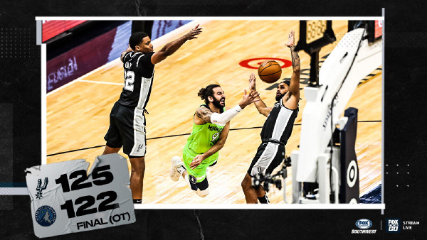 加时赛,上来穆雷先声夺人射中三分,拉塞尔突破上篮得手,约翰逊补篮命中,米尔斯外线再中三分,马刺123-117领先6分。唐斯补篮命中,米尔斯底角压着24秒中投命中,森林狼最后一攻未果,最终马刺125-122加时击败森林狼。