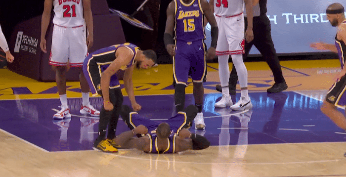 360直播吧1月9日讯 北京时间1月9日,湖人主场背靠背击败公牛,浓眉和波普都因伤缺席比赛,其中波普因脚踝伤势已经连续缺席四场比赛;湖人变阵,库兹马重回替补,马修斯和大莫里斯首发出战,詹姆斯轰下28分7篮板7助攻,急刹车慢三步和摔倒躺射2+1太疯狂,可惜外线5投0中。