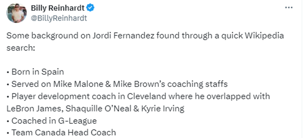 费尔南德斯是巴塞罗那人,去年他参加了猛龙、太阳和雄鹿主教练的面试;在2023年篮球世界杯上,费尔南德斯带领加拿大男篮击败美国队并且夺得世界杯铜牌,让加拿大时隔87年再次在篮球领域尝到夺得奖牌的感觉。