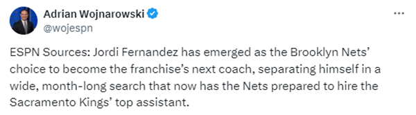360直播吧讯 北京时间4月16日,据名记Woj报道,国王助教霍尔迪-费尔南德斯将成为新任篮网主帅,篮网新帅现年41岁,曾与詹姆斯欧文共事过,去年夏天带领加拿大男篮击败美国队夺得世界杯铜牌。