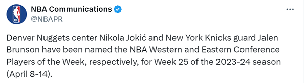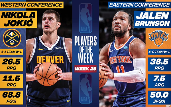 360直播吧讯 北京时间4月16日,NBA官方公布了第25周,也是常规赛最后一周的周最佳球员。掘金的约基奇当选西部周最佳,这是约基奇生涯第14次当选周最佳(队史最多),也是本赛季第2次获得这一奖项。尼克斯的布伦森当选东部周最佳,这是布伦森生涯第5次当选周最佳,也是本赛季第4次获此殊荣。詹姆斯上周场均32.7分9篮板11助攻3抢断,获得周最佳的提名。