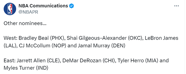 西部:比尔(太阳)、亚历山大(雷霆)、詹姆斯(湖人)、麦科勒姆(鹈鹕)、穆雷(掘金)