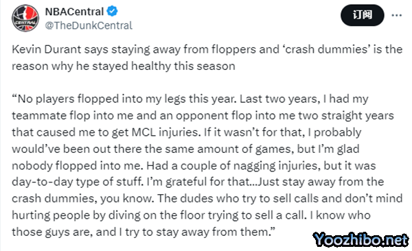 谈到本赛季上场比之前两个赛季多的原因,杜兰特表示:今年没有球员撞到我的腿。在过去的两年里,我的队友和对手连续两年都在我身上摔倒,导致我遭受MCL(右膝内侧副韧带扭伤)。如果不是因为这个原因,我可能也会打更多的比赛,但我很高兴(这个赛季)没有人在我身上摔倒。(这赛季)有几个恼人的伤病,但这是些每日观察的伤病。我很感激,离那些会假摔的人远一点。这些人为了得到犯规而假摔,从而伤害别人。我知道这些人是谁,我尽量远离他们。
