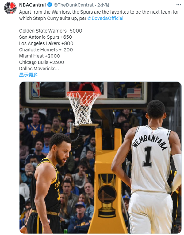 除了勇士之外,马刺是库里最可能加盟的球队,另外湖人排名第三,快船、太阳在列。