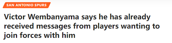 据NBA记者Josh Paredes报道,在被问到是否有球员与他谈论过组队事宜时,文班亚马表示:是的,我收到了一些信息,甚至有一些真的有可能,但我选择做我自己。这对我来说是一个全新的世界,一个我渴望发现的全新世界。可以肯定的是,早晚有一天,我会参与到球队阵容构建中的。