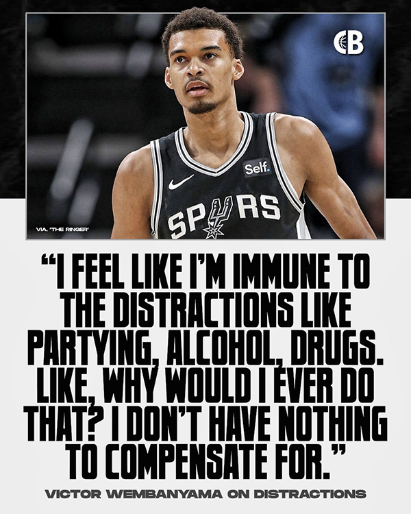 谈到自己是生活,文班表示:人们告诫我要远离的那些东西,我感觉我就是对他们免疫,像派对啊,酒精啊,毒品啊这些个干扰因素。我为什么要这么去做呢?我只专注于自己想要的东西。而且我也不需要其他的东西来慰藉,因为我选择直面‘创伤’。也不能说是创伤吧,我童年还挺幸福的,直面内心的一些东西吧。