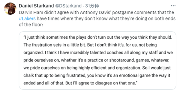 哈姆表示:我只是觉得,有时候战术并没有按照你想象的那样发展,所以挫败感会一点点袭来,但我不认为这是因为我们的团队组织性不够好,我认为我们教练组一直都非常有天赋,我们为自己感到骄傲,无论是在常规训练还是投篮训练,或还是在比赛中,无论什么,我们都为自己的高效率和组织性感到骄傲,所以我会把这归结为沮丧,你知道这是一场情绪化的比赛,所以我对此保留意见。