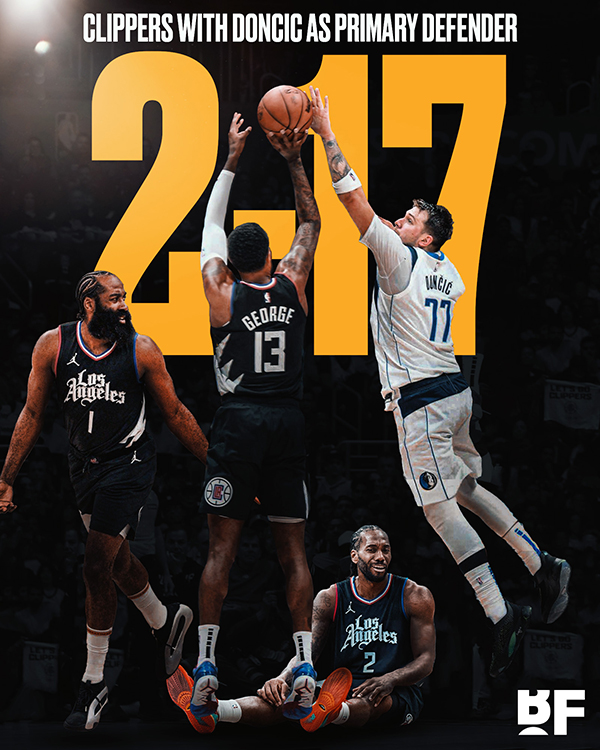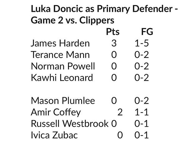 东契奇G2防守快船众将的数据出炉——在东契奇的防守下,哈登5中1拿到3分,小卡、曼恩、鲍威尔、普拉姆利都是2投0中,威少和祖巴茨1中0,卢卡防得快船众将17中2仅仅拿到5分。