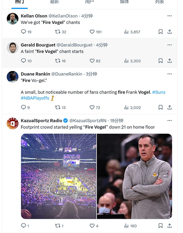 360直播吧讯 北京时间4月27日,系列赛G3回到主场,太阳109-125又被森林狼打爆了,杜兰特绝望离场,太阳球迷高呼沃格尔下课。