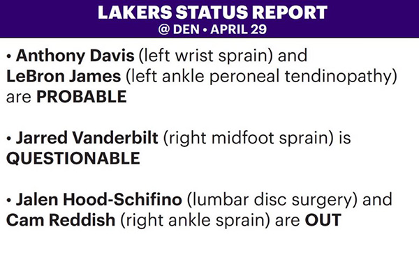 360直播吧讯 北京时间4月29日,湖人官方正式公布G5伤病报告,詹姆斯和浓眉大概率出战,范德比尔特出战成疑,有望G5复出;掘金球星穆雷出战成疑。
