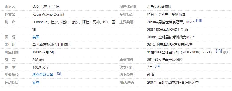 凯文·杜兰特(Kevin Durant),1988年9月29日出生于美国华盛顿哥伦比亚特区(Washington, District of Columbia),美国职业篮球运动员,司职前锋,效力于NBA布鲁克林