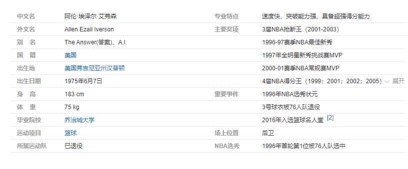 阿伦·艾弗森(Allen Iverson),1975年6月7日出生于美国弗吉尼亚州汉普顿,前美国职业篮球运动员,司职后卫(双能卫),绰号“答案”(The Answer)/AI,曾任美国男篮梦之队队长 。