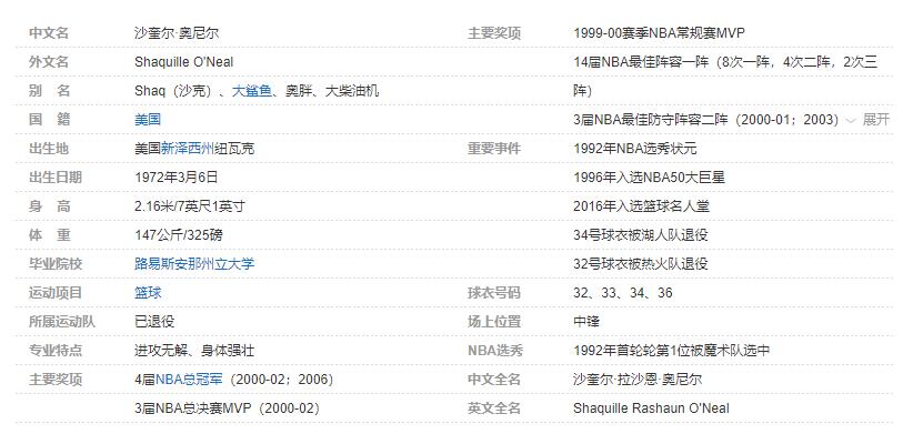 沙奎尔·奥尼尔(Shaquille O'Neal),1972年3月6日出生于美国新泽西纽瓦克,前美国职业篮球运动员,司职中锋,小名“沙克”(Shaq),绰号“大鲨鱼”。