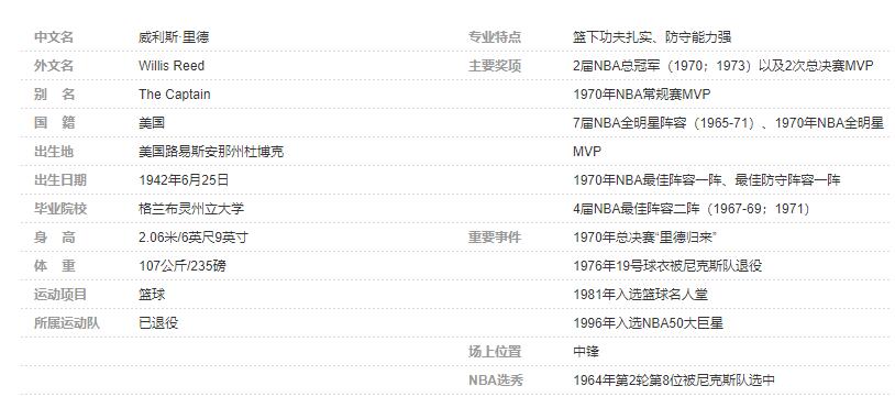 威利斯·里德(Willis Reed),1942年6月25日出生于美国路易斯安那州杜博克(Dubach,Louisiana),前美国职业篮球运动员,司职中锋/大前锋 。