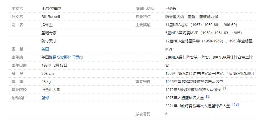 比尔·拉塞尔(Bill Russell),1934年2月12日出生于美国路易斯安那州门罗市,前美国职业篮球运动员、教练员,司职中锋,因其球员生涯获得11枚NBA总冠军戒指而绰号“指环王”,是20世纪60年代波士顿