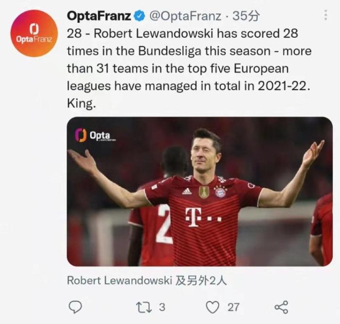 360直播吧02月26日讯 据Opta统计,莱万本赛季在德甲联赛已经斩获28球,这比五大联赛中31支球队的进球数都多。