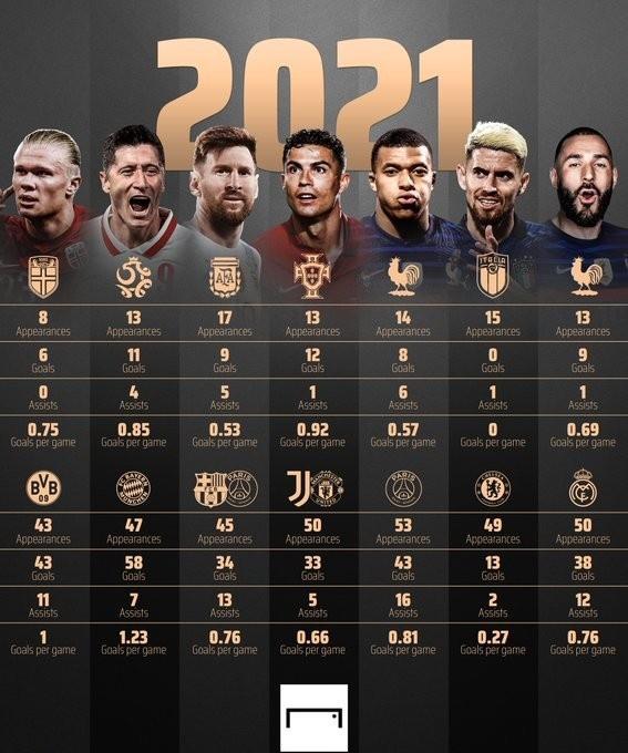360直播吧12月29日讯 进球网日前统计了哈兰德、莱万、梅西、C罗、姆巴佩、若日尼奥和本泽马七名球员2021年的数据,莱万在俱乐部场均进1球最多。