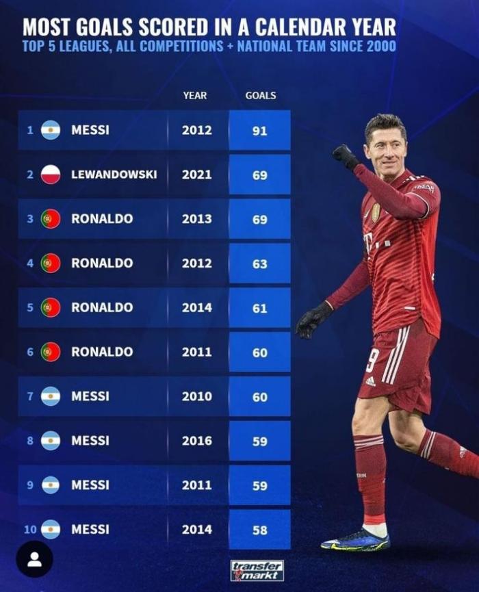 这份榜单的6-10名也都属于梅西,3-5名则都是C罗,也就是说前10中除了莱万,其他9大纪录都属于绝代双骄。