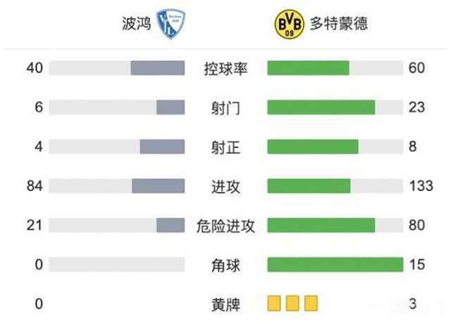 停补时5分钟。第93分钟,扎加杜战术犯规被黄牌警告。全场比赛结束,多特蒙德1-1波鸿。
