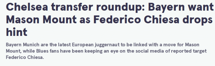 360直播吧11月28日讯 据英国媒体《镜报》援引德国媒体BavarianFootballWorks报道,拜仁有意签下切尔西中场芒特,而切尔西方面的引援目标则是效力于尤文的边锋小基耶萨和本菲卡中锋努涅斯。