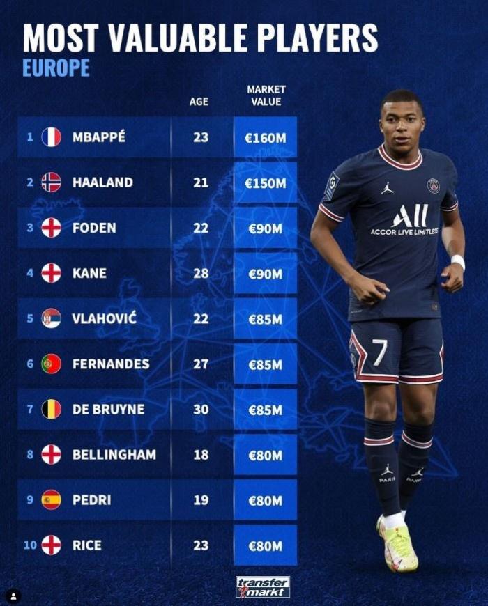 360直播吧06月27日讯 今日,德转盘点欧洲的球员身价排行榜,前二分别是1.6亿欧的姆巴佩和1.5亿欧的哈兰德。