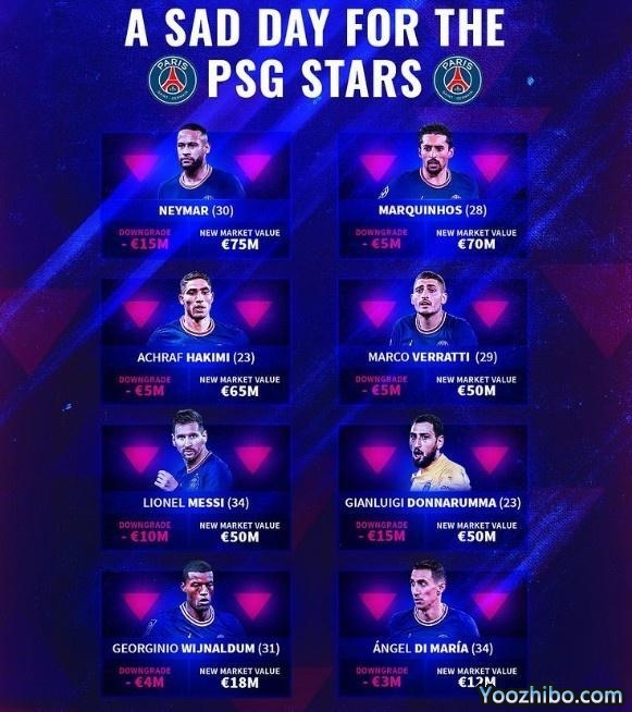 360直播吧05月31日讯 德国转会市场今天更新了巴黎全队身价,一线队有八名球员身价下跌,梅西身价现在已跌至5000万欧元。