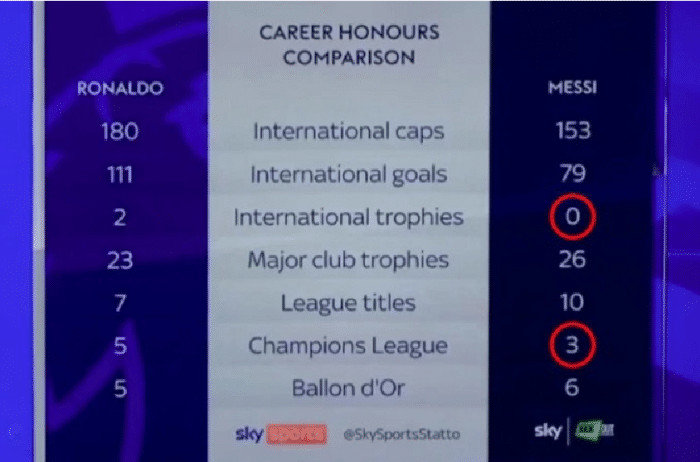 360直播吧9月14日讯 不得不说,英格兰的足球媒体经常喜欢做出一些有争议的事情,此前穆里尼奥在英超执教的时候,他们就经常黑穆里尼奥。穆里尼奥的一点小事他们都争相报道,穆里尼奥赛后新闻发布会,他们总是去曲解穆帅的意思。而现在,他们又来了。他们近期盘点了梅西和C罗职业生涯的各项数据,而却漏掉了梅西的美洲杯和奥运会冠军,不知道是不是故意的呢?可能性很大哦!