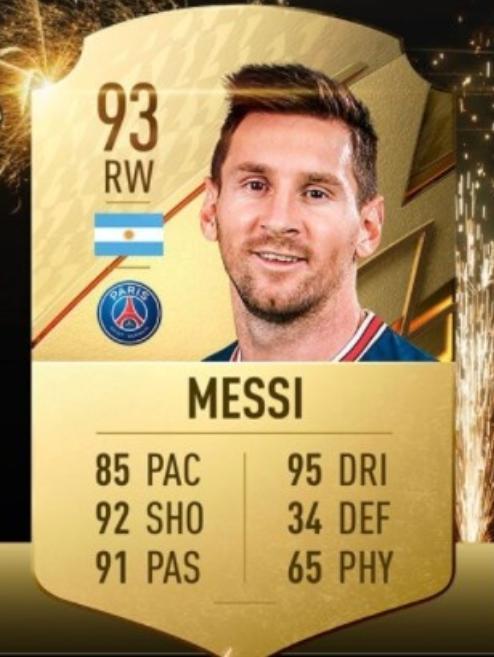 梅西的评分是整个游戏里所有球员中最高的,他的速度评分85,盘带95,射门92,防守34,传球91,身体65,总分93。