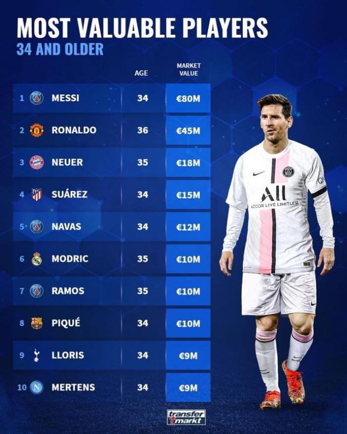 360直播吧9月05日讯 今日,德转更新了世界足坛34岁及以上球员的身价榜单,其中梅西8000万欧居首,C罗4500万欧位列次席。
