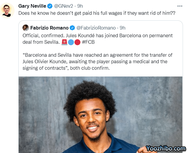 360直播吧07月29日讯今天巴萨官宣签下塞维利亚中卫孔德,随后曼联名宿加里-内维尔在推特上发文嘲讽巴萨。