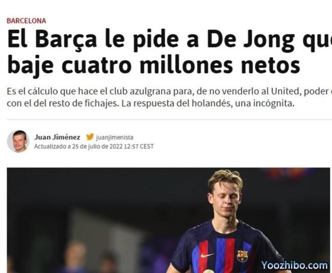 360直播吧07月26日讯 关于德容的去留问题一直牵动着球迷们的心,今日,阿斯报消息,如果德容留队,巴萨要求他新赛季的薪水净额减少400万欧元。巴萨方面希望德容的薪水与球队新援的薪水相匹配,以便完成注册。
