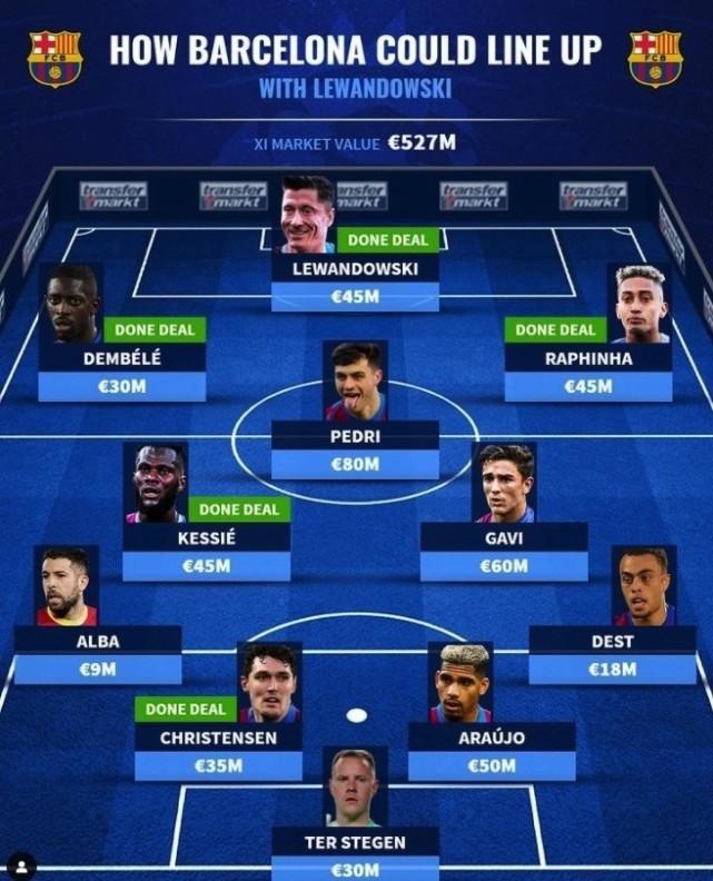 360直播吧07月17日讯 凌晨,巴萨官方宣布与拜仁就莱万多夫斯基的转会达成了协议。待球员通过体检并且签约完成后,就将正式加盟。而在莱万正式成为巴萨球员后,德国《转会市场》也列出了巴萨新赛季的4-3-3首发强阵,而这11人身价总额高达4.47亿欧元。