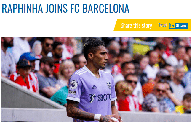 360直播吧07月16日讯2020年10月转会窗截止日,拉菲尼亚加盟利兹联,在客场击败埃弗顿的比赛中打进了加盟利兹联后的首球。他共为利兹出场67次打进17球。
