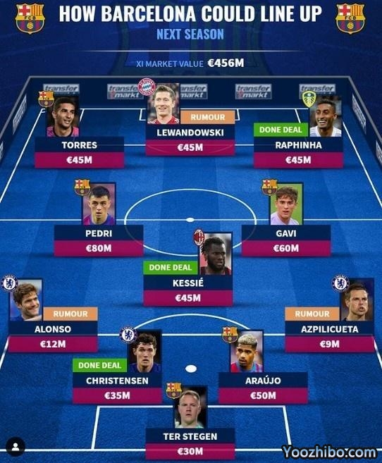 360直播吧07月13日讯 今日,《转会市场》根据近期转会市场动态预测了巴萨新赛季主力阵容。