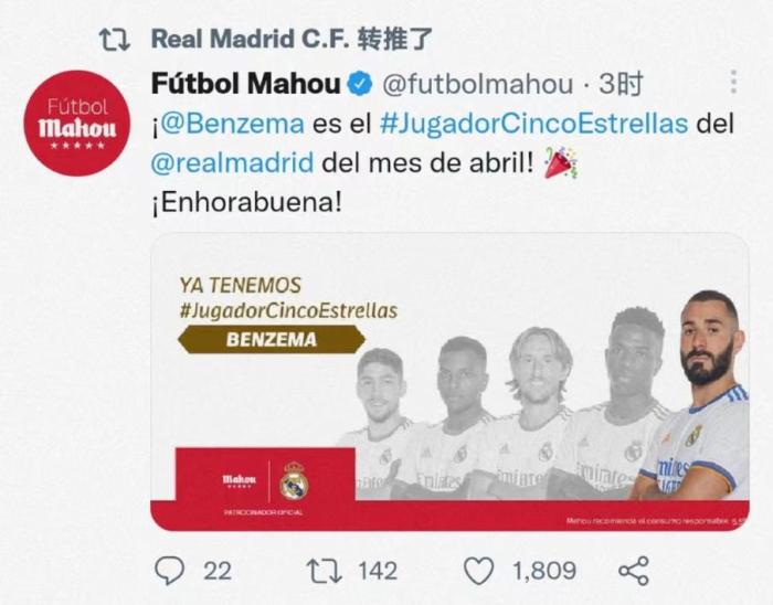 360直播吧05月07日讯 ,皇马官方转发了合作伙伴Mahou的动态,本泽马获得4月队内最佳球员。