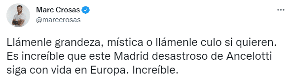 360直播吧04月27日讯 消息,前巴塞罗那球员马克-克罗萨斯发推称,这支灾难性的皇马在欧冠还活着令人惊讶。